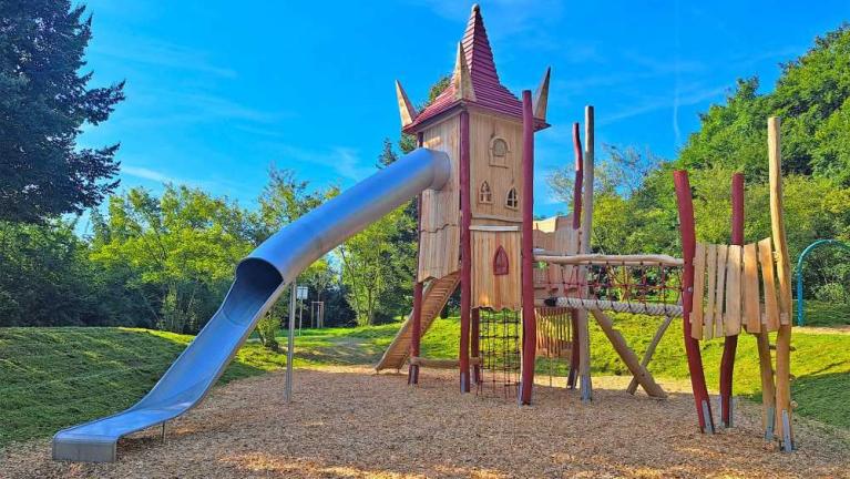 Die Fundamente sind ausgehärtet und es erfolgte die Erstabnahme des Gerätes. Damit ist die Spielburg ab sofort zum Bespielen freigegeben. Aufgrund der Umbaumaßnahmen und Zwischenlagerungen von Bodenaushub mussten Teile der vorherigen Rasenflächen neu eingesät werden. Die Abteilung Grünflächen der Stadt bittet daher noch um Rücksichtnahme und Nicht-Betreten der neu eingesäten Flächen.