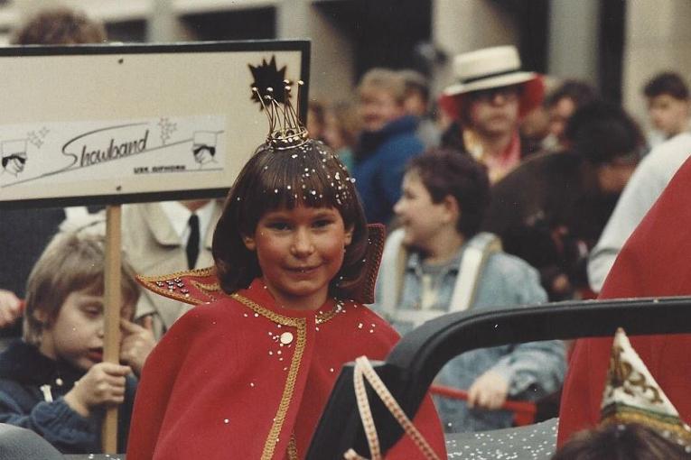 Gerührt fährt sie fort: „die Mitglieder kennen mich schon als ich noch Windeln anhatte. Jetzt haben sie mich zu ihrer Präsidentin gewählt. Damals war ich auch einmal Kinderprinzessin. Das muss der 10. Schoduvel im Jahr 1988 gewesen sein. Da gab es noch keine großen Wägen. Die meisten sind zu Fuß gegangen und wir durften als Kinderprinzenpaar in einem hellblauen Golf1 -Cabrio fahren. Wir sind so stolz gewesen“ erinnert sich die blonde Amtsinhaberin mit glänzenden Augen.