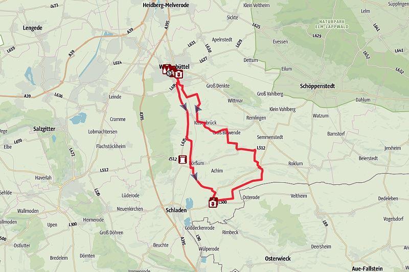 Via Wolfenbüttel – Ohrum – Dorstadt – Hornburg – Großes Bruch – Hedeper – Timmern – Gr. Biewende – Kissenbrück – Neindorf - Wolfenbüttel.