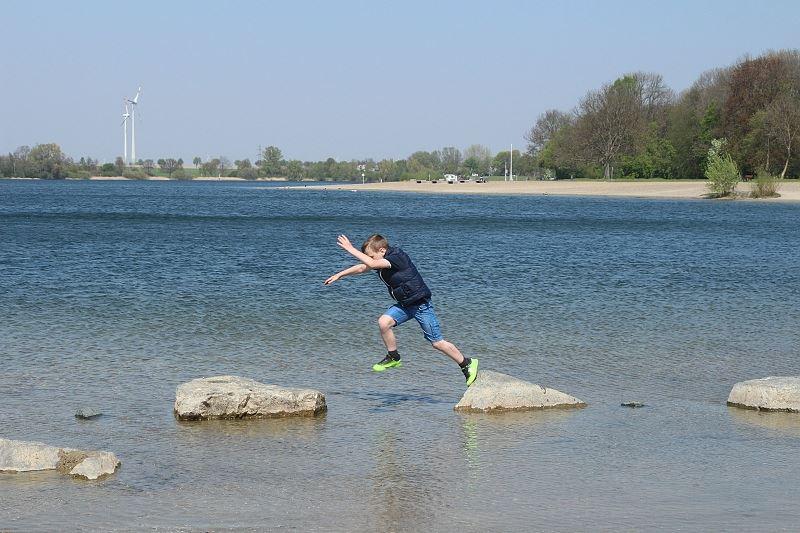 An sonnigen, heißen Sommertagen sind alle Sitzmöglichkeiten gut genutzt. Auch heute picknicken Mütter mit ihren Kindern auf Decken, essen an den Holzsitzgelegenheiten ihre mitgebrachten Obst- und Gemüseschnitzel. So auch die Freundinnen Yvonne und Rike aus Braunschweig, die mit ihren Kindern gerne hierher kommen. „Das Angebot ist einfach toll. Das Gelände ist abwechslungsreich und es ist für jede Altersklasse was dabei“, schwärmt Rike. Sohn Theo lässt sich in Badehose ins flache Wasser fallen. Das ist uns für Ende April noch zu kalt. Aber ich beobachte das frohe Treiben am Eichentisch sitzend mit Blick auf die Kinder an den Spielgeräte.