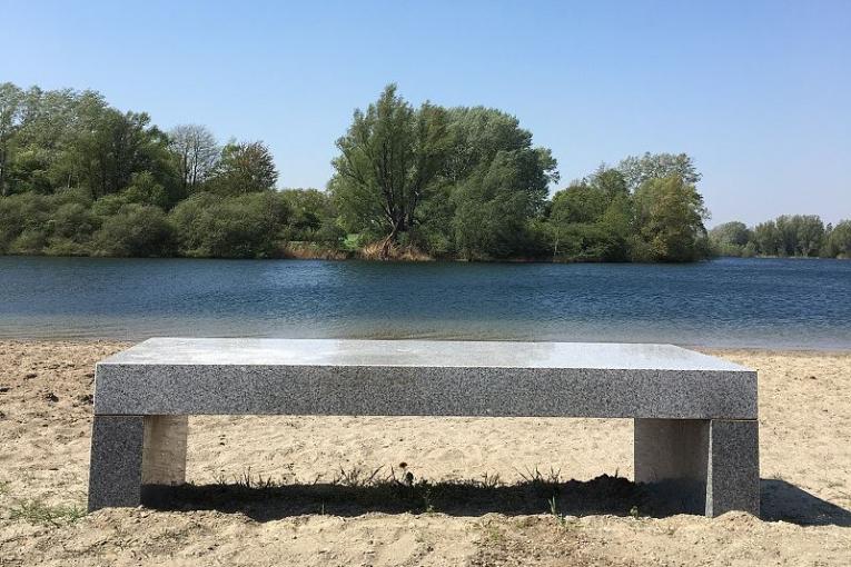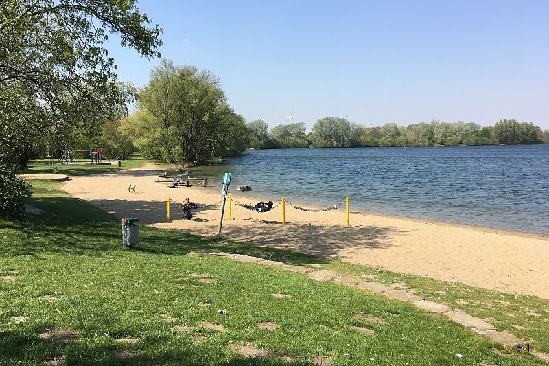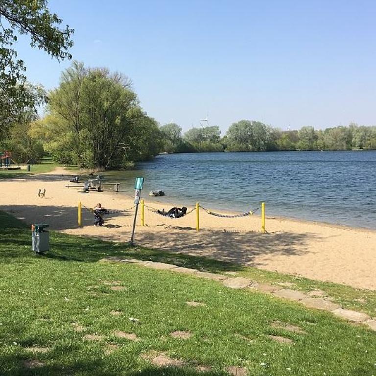 Wir machen ein Foto im roten Fotorahmen, das Kind gräbt kurz im Sand nach Steinen und wenig später zielen wir die Insel an. Die Pylonbrücke in den Welfenfarben blau gelb regt zu kreativen Fotomotiven an. Und schwups stehen wir auf der Insel, dem Mekka der Disc-Golfer der Region. Im November 2011 eröffnete die 12 Bahnen umfassende Discgolf-Anlage. Die Scheiben für den Parcours können an der Eissporthalle und an der Wasserskiseilbahn gegen eine Gebühr von 1 Euro und 10 Euro Pfand gemietet werden. Am Nordufer der 23 Hektar großen Insel befindet sich die Hundebadestelle. Hier treffen wir Besucherin Ingrid Gissel mit Labradoodle Lucy. An heißen Tagen kommen sie fast täglich hierher: „Es ist ideal hier. Den Hunden gefällt es außerordentlich. Sie bekommen Abkühlung und Bewegung. Man findet selten solche Orte, wo Hunde baden gehen dürfen.“ Allein oder in Gruppen – die Badestelle wird von vielen Hundebesitzern gerne genutzt. Die Seniorin komme gerne an den See und schwimme regelmäßig. „Der See hat einen großen Erholungswert für mich“, berichtet die Lichtenbergerin.