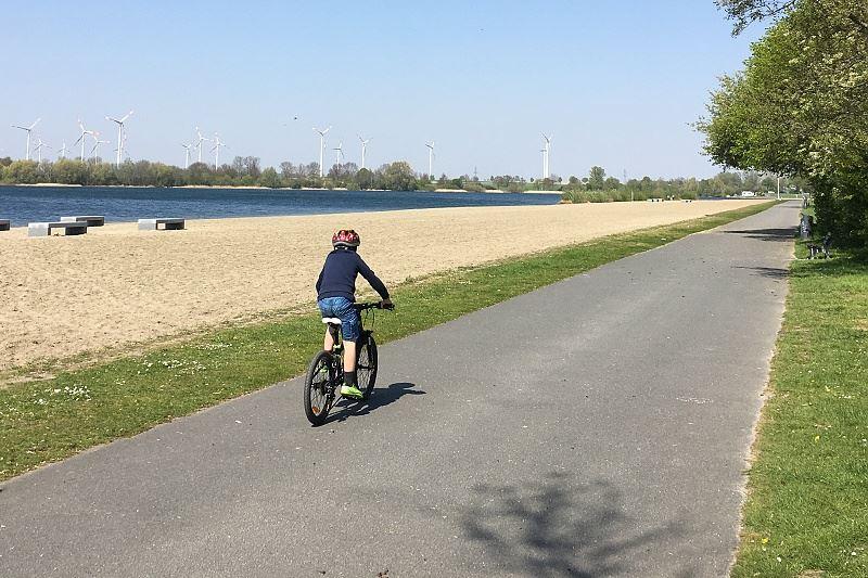Philipp hopst von Stein zu Stein, die im Wasser liegen. Ich halte die Luft an, aber seine kleinen Beine und besonders die Turnschuhe bleiben trocken. Wir haben schließlich noch viel vor. Ich dränge zum Aufbruch. Die Pferde werden gesattelt und es geht Richtung Norden weiter am Toilettenhäuschen und der Beachvolleyballanlage vorbei. Inlineskater und Spaziergänger kommen uns entgegen. Auch das Fahrzeug des Städtischen Regiebetriebes kontrolliert Wege, Sitzmöglichkeiten und leert Mülleimer.
