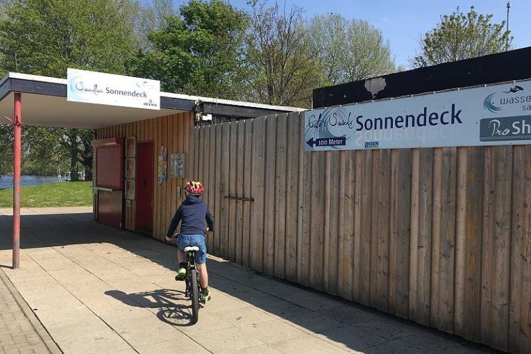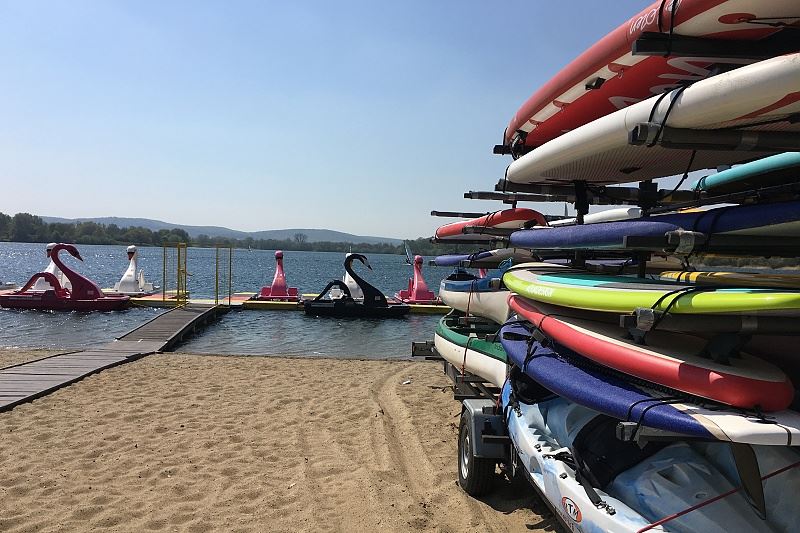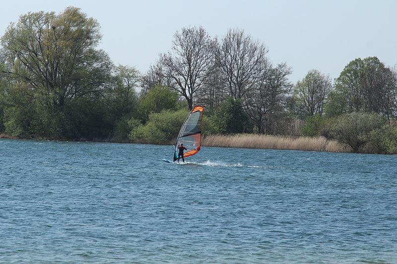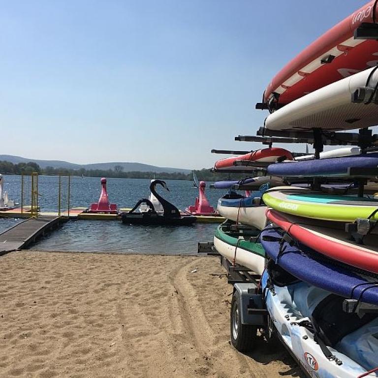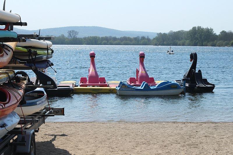 Alles macht einen sauberen Eindruck. Kurzer Halt an einer der Granitbänke am Ufer. Wir beobachten die Enten und Schwäne und essen Kekse. Der Sandstrand ist nahezu menschenleer. Idylle pur, ein Fünkchen Urlaubsfeeling kommt auf. 20 Minuten später erreichen wir die Reppnersche Bucht mit dem großen Parkplatz, Aussichtsturm, dem Café del Lago und der Bootsstation. Schon von weitem sind die großen Schwäne – Tretboote in verschiedenen Farben – zu sehen. Diese, sowie Kajaks, Kanus, und SUP Boards können ausgeliehen werden. Wir haben allerdings Hunger und setzen uns ins Café del Lago, mit schönem Blick auf See und Surfer.