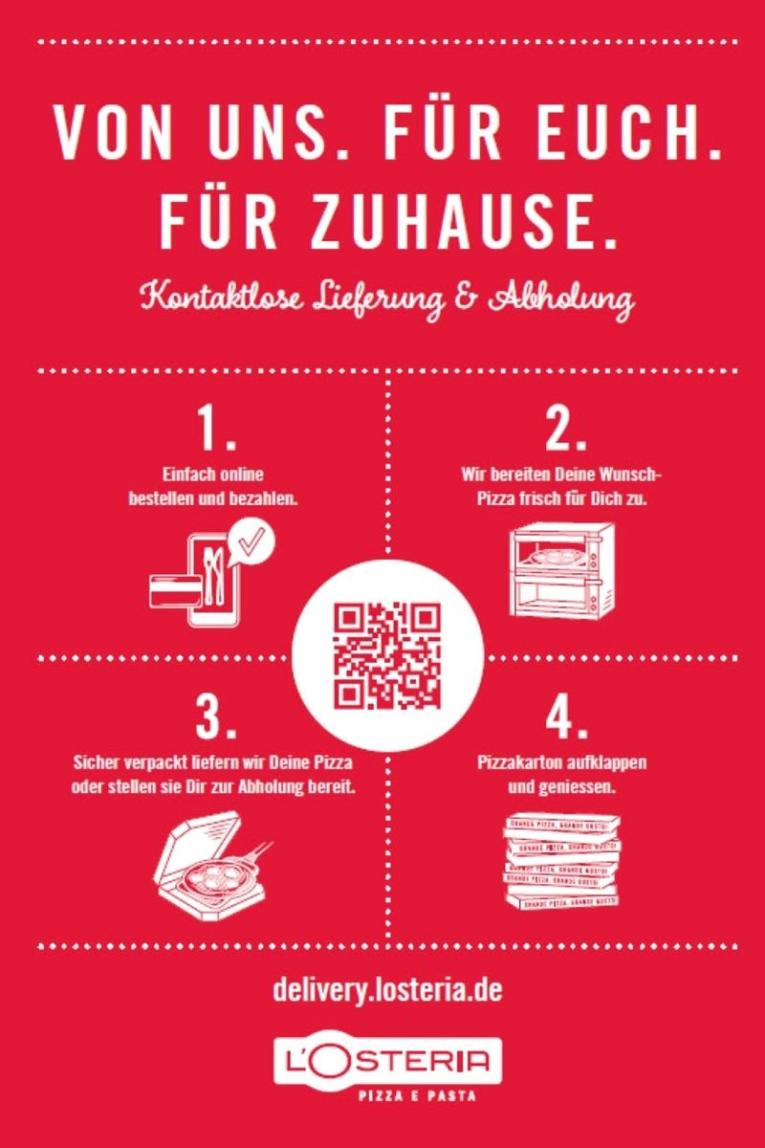 LOsteria Braunschweig: Ja, du kannst bei uns kontaktlos über einen QR-Code (Karte im Anhang) sogar noch vor Ort bestellen, oder von zu Hause unter delivery.losteria.de und liefern lassen. Telefonisch unter 0531 7074 7190 und über Lieferando.de sind wir auch erreichbar. Alles selbstverständlich kontaktlos! Ebenso beliebt ist die Abholung. Hier einfach die Bestellung per Anruf durchgeben und bei uns abholen.