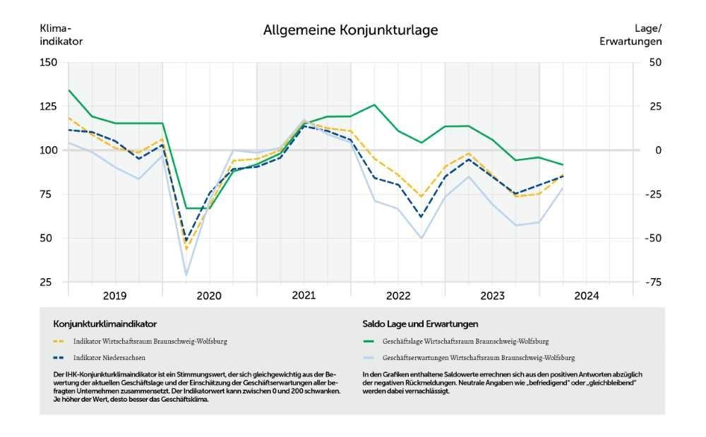 Die konjunkturelle Lage der Unternehmen im Wirtschaftsraum Braunschweig-Wolfsburg bleibt auch im Frühjahr schwierig. Dies zeigt der gemeinsame Konjunkturbericht der IHK Braunschweig und der IHK Lüneburg-Wolfsburg (IHKLW) für das erste Quartal 2024. Zwar konnte der IHK-Konjunkturklimaindikator, der sowohl die aktuelle geschäftliche Lage als auch die Geschäftserwartungen der Unternehmen abbildet, um 10 Punkte zulegen und einen – nach wie vor sehr mäßigen – Stand von 85 erreichen; dieser Anstieg gründet sich aber allein auf die mittlerweile nicht mehr gar so düsteren Geschäftsprognosen für den weiteren Jahresverlauf. Dagegen hat sich die geschäftliche Lage der Betriebe sogar noch einmal verschlechtert. Aktuell bezeichnet nur jeder fünfte befragte Betrieb seine Situation als gut. Etwas mehr als die Hälfte sieht sie wenigstens als befriedigend an, 28 Prozent der befragten Unternehmen beurteilen ihre Situation jedoch als schlecht. Aus den guten und schlechten Lagebewertungen ergibt sich ein Saldo von -8. So schwach war dieser Wert zuletzt vor mehr als drei Jahren ausgefallen.