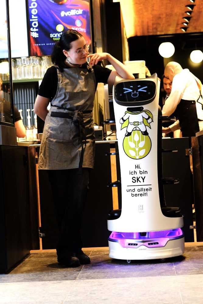 Und die beiden technologisierten Kollegen haben es in sich: Es handelt sich um die neueste Generation an Lieferrobotern. Ihr Markenzeichen: Eine bemerkenswerte Fähigkeit zu Mensch-Roboter-Interaktion. Scott und Sky haben nicht nur eine dreidimensionale Hinderniserkennung – sie zeichnen sich insbesondere durch eine multimodale Interaktion aus, etwa durch Einfluss von Sprache, Licht, Mimik und Berührung. sander’s backstube betreibt 25 Fachgeschäfte in der Region und beschäftigt dabei rund 300 Mitarbeitende. „Wir tun viel für eine nachhaltige Personalentwicklung, gleichwohl beschäftigen wir uns sehr intensiv mit neuen Tools“, so die Prokuristin. Das Roboter-Duo soll dabei vor allem den Tischservice möglich machen.