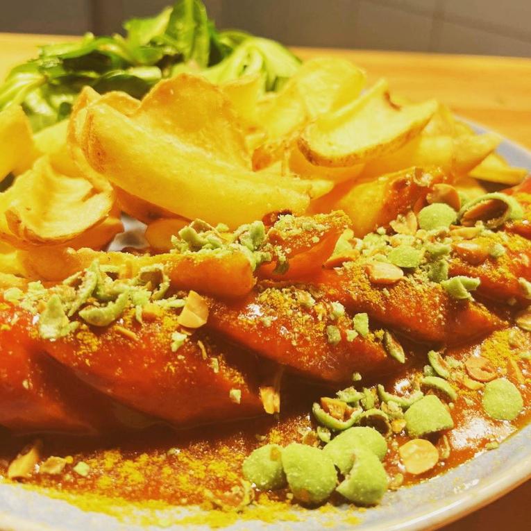 Zwar könnte man das Menü noch immer unter dem Schlagwort „Deutsche Küche“ zusammenfassen, jedoch werden traditionelle Gerichte hier mit einem außergewöhnlichen Twist zubereitet. So wird etwa eine klassische Currywurst dank einer fruchtigen Orange-Mango-Currysauce, pikantem Wasabi-Crunch und Kartoffeln anstelle von Pommes in ein vollwertiges Crossover-Hauptgericht mit asiatischen Einflüssen verwandelt. „Wir erfinden das Rad nicht neu, aber experimentieren gerne. Das ist einfach unsere Art!“, berichten Maxi und Tim. Aber was ist aus dem Traum der eigenen Pizzeria geworden? „Wir haben einfach überlegt, was hier bisher gut funktioniert hat und was in ein modernes Wirtshaus passt. Pizza passte hier einfach nicht rein, also haben wir ein ganz neues Konzept entworfen. Schließlich kann man auch toll deutsch essen!“, erklärt Maxi. Das fein zusammengestellte Menü unterstreicht diese These: Highlight der Karte sind die Ochsenbäckchen mit Steckrübenpüree und Spinat, die es so nirgendwo sonst in der Löwenstadt gibt.