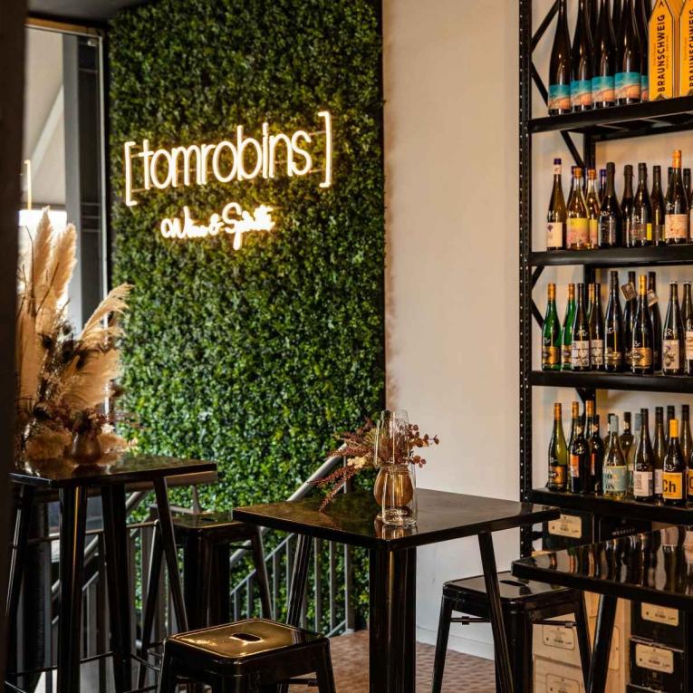 Inmitten der Braunschweiger Innenstadt wurde im Sommer das Tomrobins eröffnet. An langen Tagen kommt hier sogar noch Sonne hin, wenn es auf dem Kohlmarkt schon schattig ist und auch die Nachbarschaft in der Schützenstraße ist abwechslungsreich, hip und attraktiv – die Vinothek schließt hier eine Lücke. „Eine coole, moderne Weinbar gibt es in Braunschweig quasi nicht und deshalb wollten wir diese Erweiterung des Marktes hier anbieten“, berichtet Robin. Mit seiner auffälligen Leuchtschrift und saftig grüner Mooswand sticht das Tomrobins einem hier sofort ins Auge. In der Ladenmitte des oberen Barbereichs laden hohe Tische und Hocker zum Verweilen ein, ringsherum stehen prall gefüllte Regale mit Weinen, die darauf warten, entdeckt und probiert zu werden. Inzwischen wurde auch dem geräumigen Keller ein modernes Bar-Ambiente verliehen und dieser bietet zahlreiche weitere Sitzplätze. Darüber hinaus eignet sich das Untergeschoss für diverse Veranstaltungen – aktuell ist dort beispielsweise in Kooperation mit der Galerie Jaeschke eine Ausstellung der Künstlerin Fee Gunkel zu sehen.