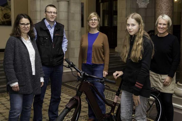 Vertreterinnen und Vertreter von Stadt Braunschweig und einem Sponsor überreichen den Hauptgewinn (v. l. n. r.): Christine Frenzel, Burkhard Wiegel, Dr. Amrit Bruns (alle Stadt Braunschweig, Fachbereich Tiefbau und Verkehr), Helene Fleer (Gewinnerin) und Angela Kleinhans (Volkswagen Financial Services).